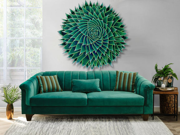 Acrylic on canvas, with additionally attached canvas on the edge of the round frame for the overall painting to have a real shape of aloe. The sculptured paste is used for the spines on the leaves for a 3D effect.